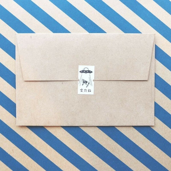 A surreal sticker with the message "See you again" in a scene where a cow is taken away by a UFO. Please use them to seal your letters or as a point of reference.